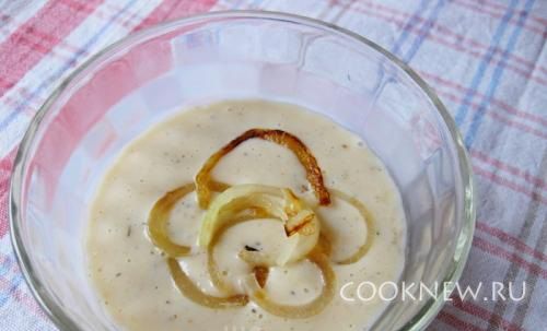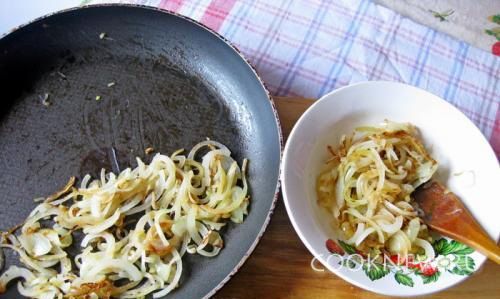 Количество готового лука разделите пополам.