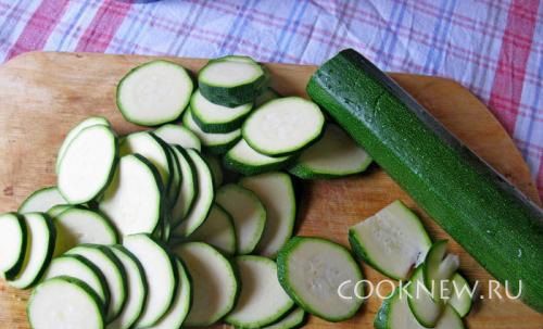 Цуккини хорошо вымойте и нарежьте тонкими кружками, слегка посолите их и оставьте минут на десять.
