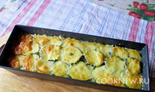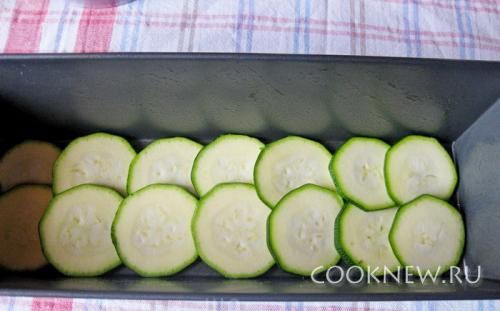 В длинную прямоугольную форму выложите кружочки кабачков, чтобы они покрыли дно