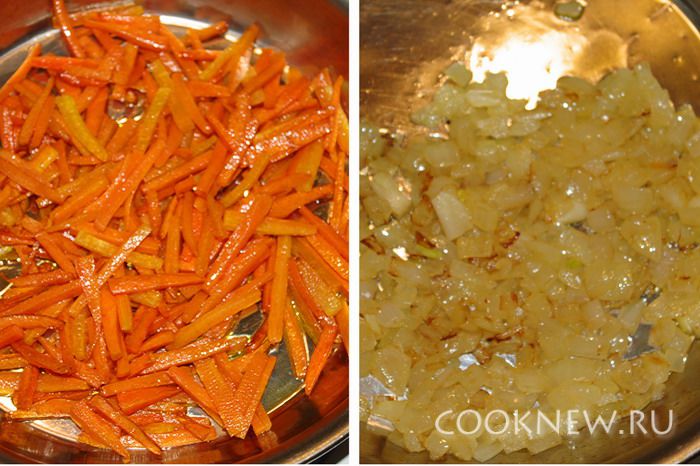 Морковь, нарезанную длинными брусочками, слегка припускаем на масле. С измельченной луковицей поступаем аналогично.