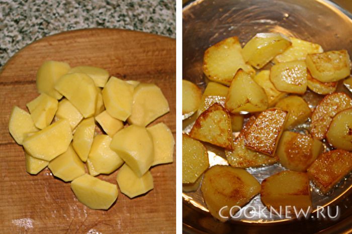 Картофелины разрезаем на куски среднего размера, обжариваем (не присаливая) до образования аппетитной корочки