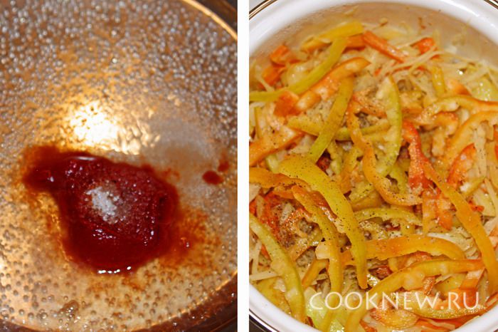 Укладываем в емкость обработанные составляющие. Сверху выкладываем, измельченный длинными полосами, болгарский перец. В воду, закипающую на сковороде, водим немного томатной пасты (соуса, густого сока), всыпаем сахар, присаливаем. Провариваем заправку для рагу несколько минут (при среднем огне), заливаем припущенные овощи. Перемешиваем составляющие, приперчиваем, присаливаем. Томить овощную смесь (при несильном огне) нужно минут 15