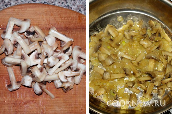 Тем временем подготовим шампиньоны. Измельченную луковицу доводим на масле до полупрозрачного состояния. Каждый очищенный гриб делим на четыре части, всыпаем к луку, тушим (на несильном огне) минут 10.