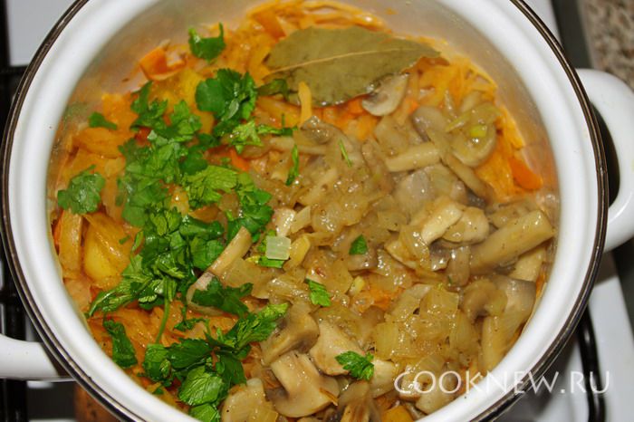 Луково-грибную часть рагу добавляем к овощной смеси, притрушиваем зеленью, добавляем лист лавра. Под крышкой все составляющие овощного рагу томятся (на среднем огне) еще минут 5. Желательно, чтобы готовое рагу настоялось хотя бы 10-15 минут