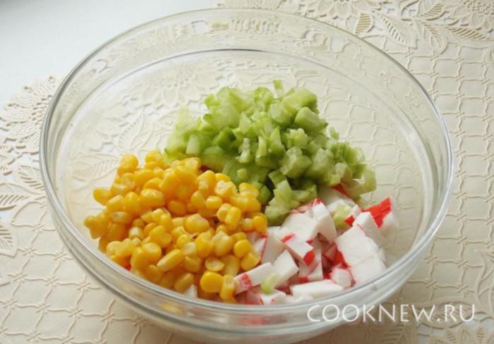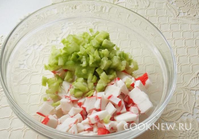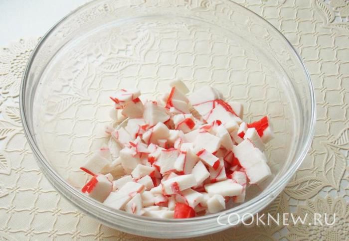 Мелко режем крабовые палочки.