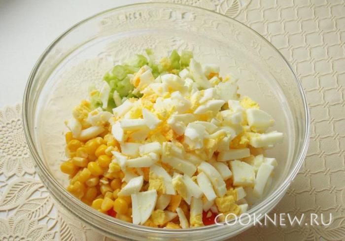 Варим яйца, охлаждаем и тоже мелко нарезаем.