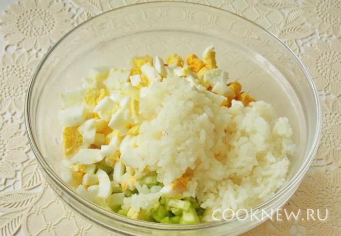 Отвариваем рис, промываем и кладем в салат. Заправляем салат майонезом, сметаной. Солим и перчим по вкусу