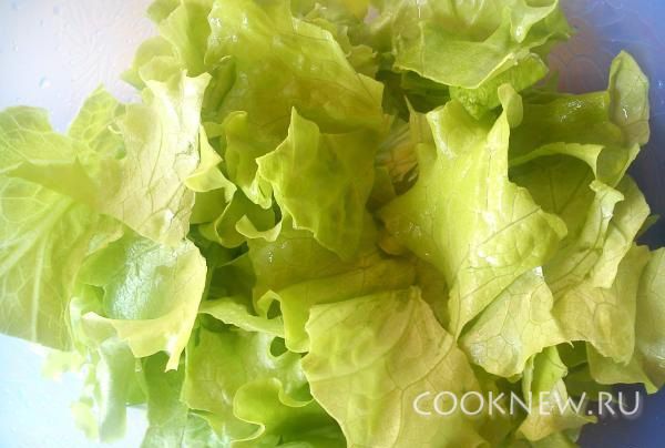 Лист салата помыть, просушить и измельчить на небольшие кусочки.