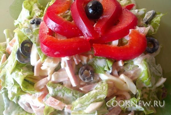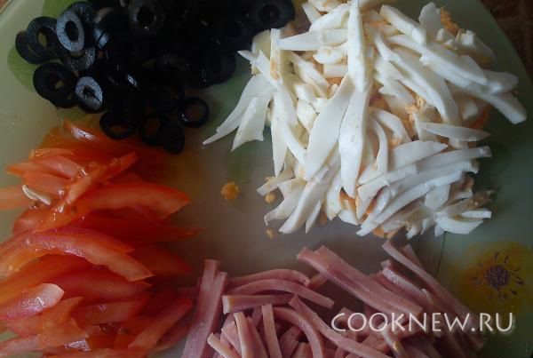 Яйца отварить,порезать соломкой. Помидор порезать соломкой.Ветчину также порезать соломкой. Маслины порезать кружочками