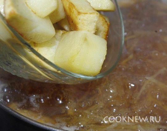 Когда свекла будет готова, добавляем картофель.