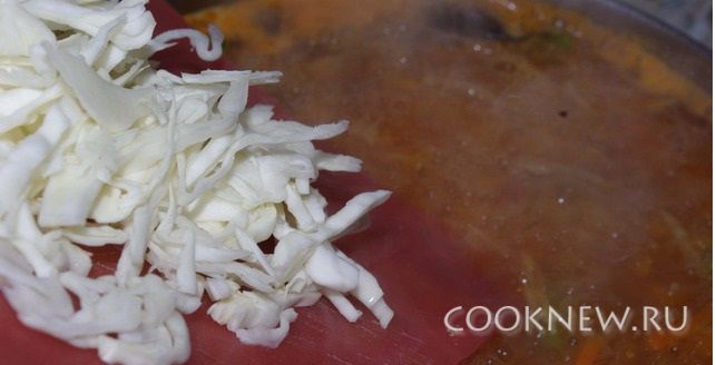 Капусту шинкуем и добавляем в суп.