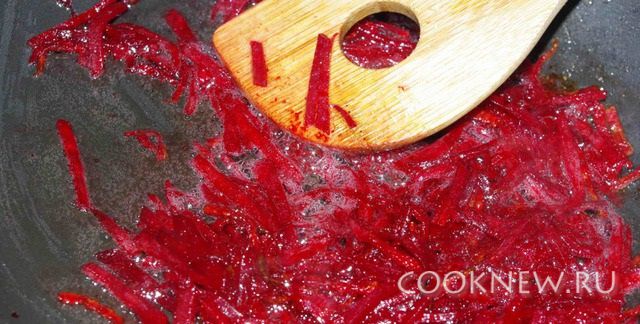 2 литра воды ставим на огонь. Очищаем и нарезаем соломкой свеклы и обжариваем на растительном масле.