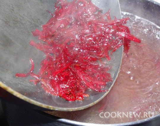 Когда вода закипит, добавляем туда и варим почти до готовности свеклы.