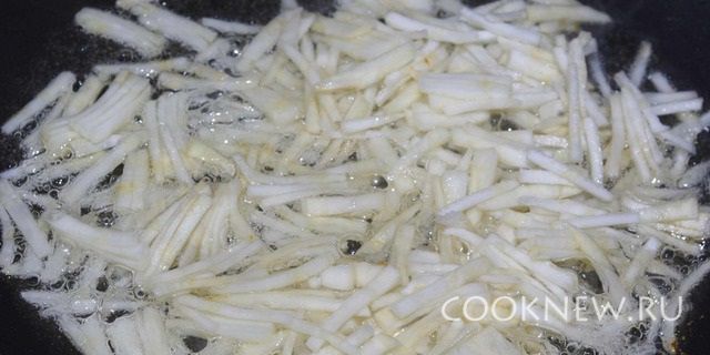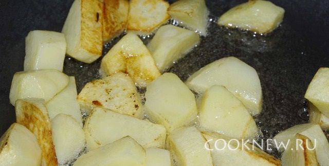 Очищенный картофель обжариваем до полуготовности на растительном масле.