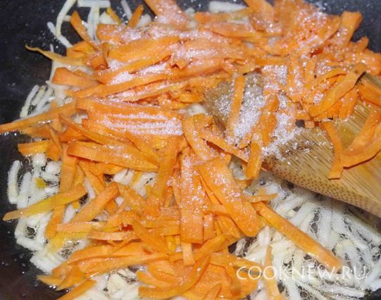 Морковь также нарезаем соломкой, добавляем к сельдерею и жарим. По желанию можно добавить сахар.