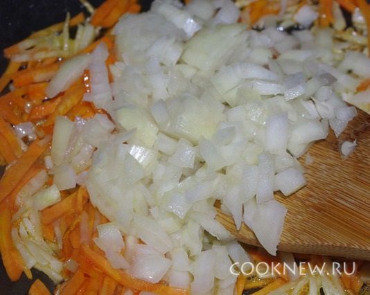 Нарезаем лук и добавляем к нашей зажарке.