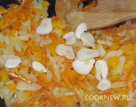 Также добавляем порезанный болгарский перец и порезанный чеснок.