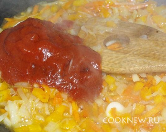 Добавляем томатную пасту(можно помидоры), немного обжариваем её и потом добавляем немного бульона (из кастрюли, в которой варятся свекла и грибы), тушим минутки 3-4.