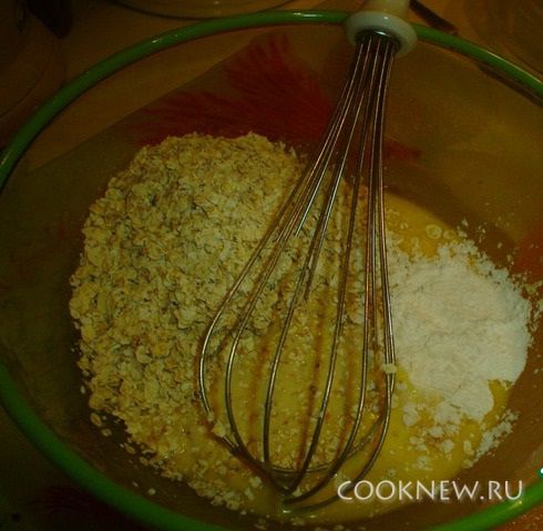 Добавить молоко, овсянку, крахмал, разрыхлитель. Хорошо перемешать.
