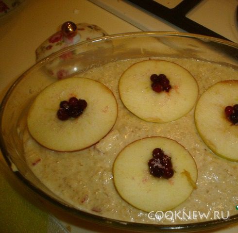 Выложить кашу в форму, положить сверху яблочные кружки. Сверху яблоки можно украсить ягодами.