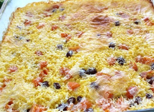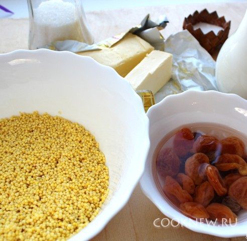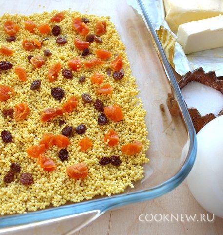 С пшена сливаем воду. Отжимаем изюм, курагу, мелко нарезаем, всё смешиваем с пшеном. Распределяем всё в форме и аккуратно заливаем молоком, так чтобы молоко полностью покрыло пшено.