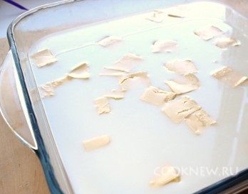 Сверху на молоко добавляем кусочки сливочного масла. Ставим в разогретую до 190 градусов духовку на 1 час 30 минут. Если он быстро зарумянится, температуру снизить на 10 градусов.