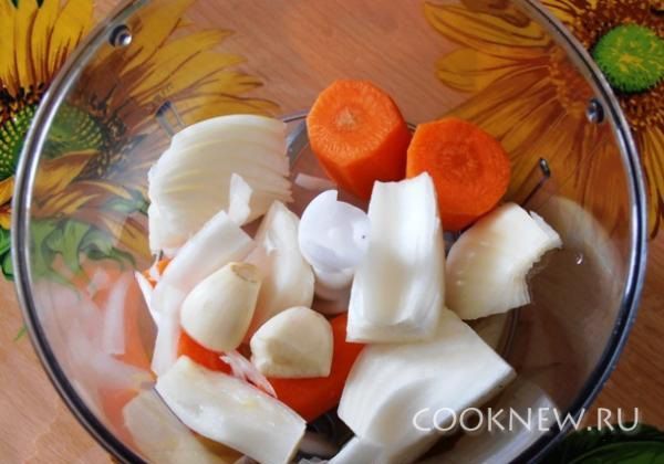 В чашу блендера кладем морковь и лук.