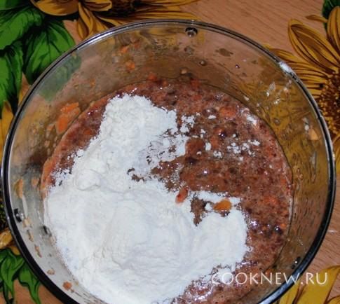 Добавляем муку и еще раз перемешиваем ложкой.