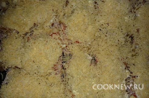 Обильно посыпать тертым сыром и поставить в духовку (170 С)на 30 минут.