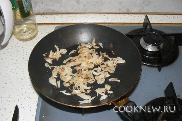 Лук измельчаем и обжариваем.