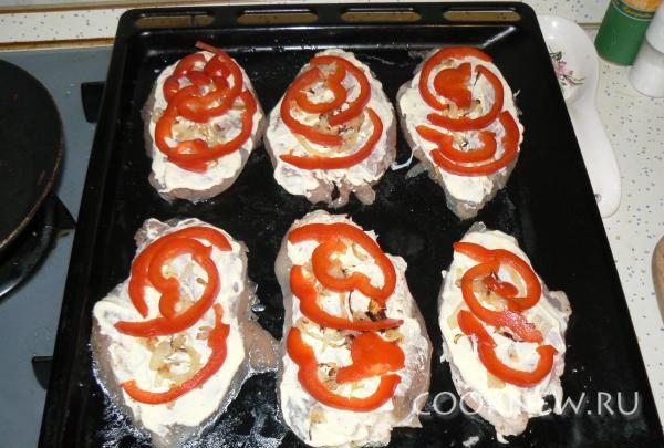 На противень выложить куриное филе, хорошенько намазать каждый кусочек майонезом, сверху выложить жареный лучок, перчик и сыр. Ставим противень в духовку 160 градусов и оставляем запекаться на 30-35 минут.