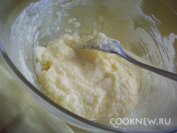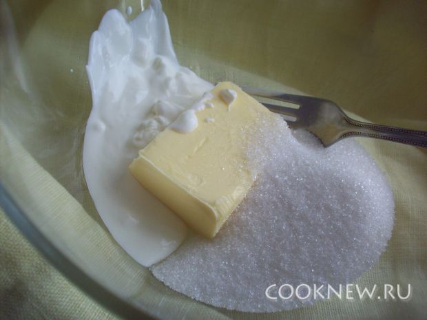 Масло комнатной температуры соединяем с сахаром(3/4 стакана) и сметаной. Добавляем разрыхлитель и соль.