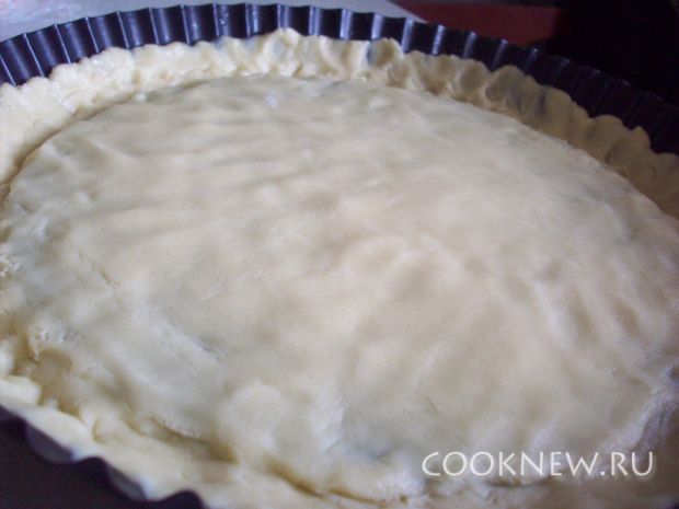 Добавляем муку и замешиваем тесто. Треть теста оставляем для присыпки. Форму смазываем немного растительным маслом и выкладываем тесто, осторожно растягивая его руками к бортикам.