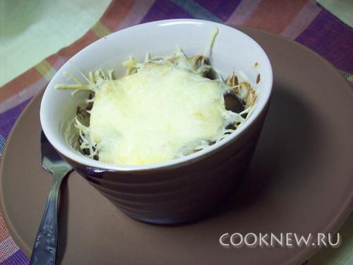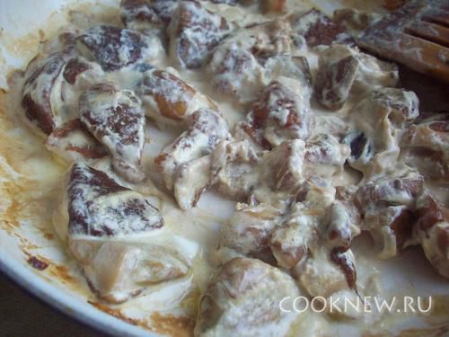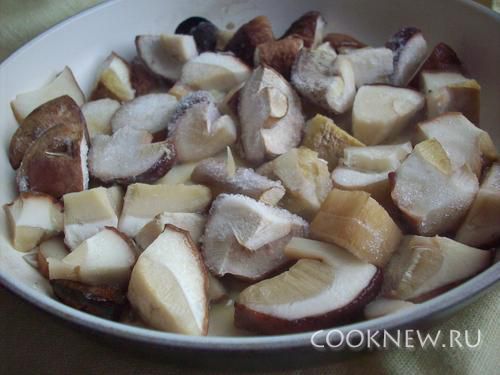 В сковородку кладем кусочек сливочного масла и добавляем замороженные грибы. Обжариваем где-то 20 минут.