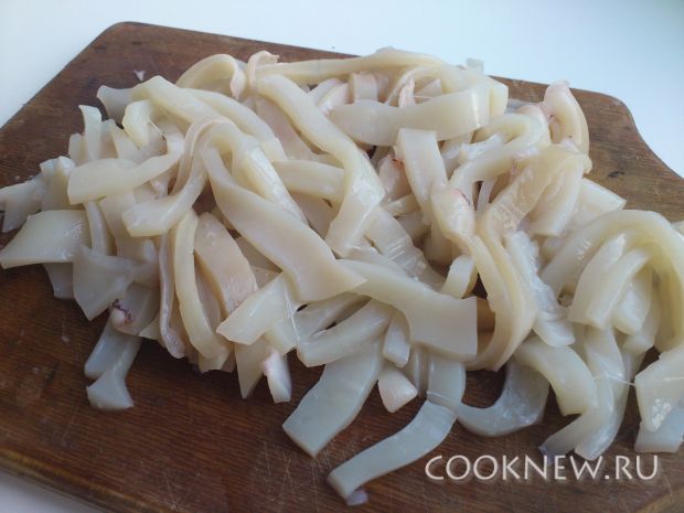 Филе кальмаров режем полосками.