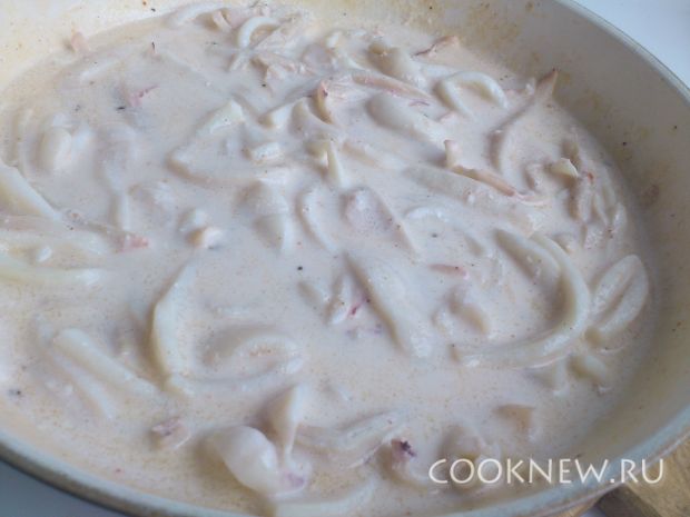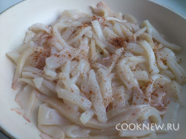 На разогретую сковородку наливаем столовую ложку масла и выкладываем кальмаров. Солим, перчим по вкусу. Жарим в течение 1 минуты.