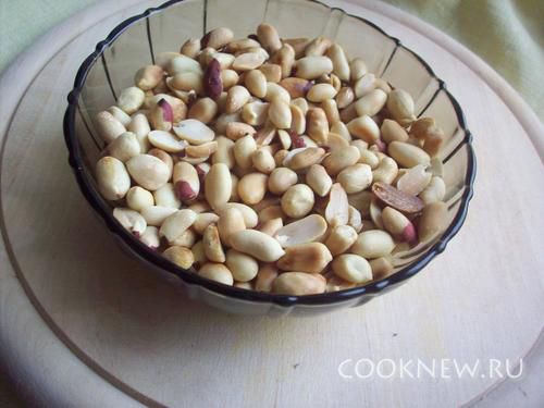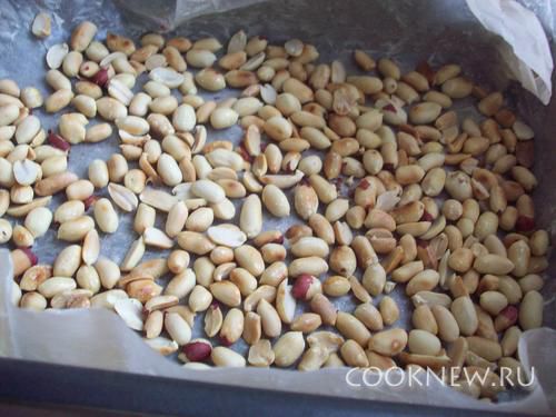 На раскаленную сковородку положите арахис и прокалите пока шкурка не станет легко отпадать,а сам орех станет слегка золотистого цвета.
