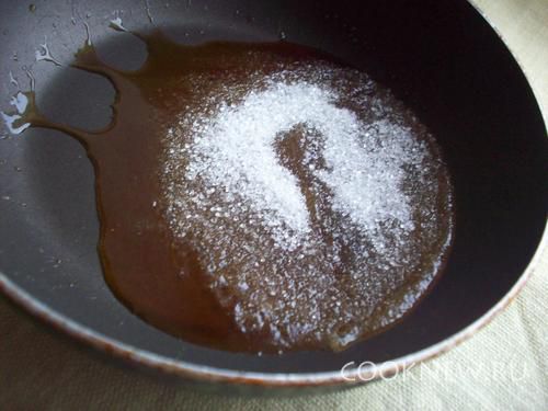 На сковороду насыпать 0,5 стакана сахара и расплавить его.