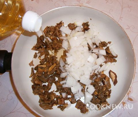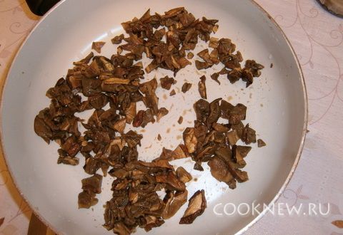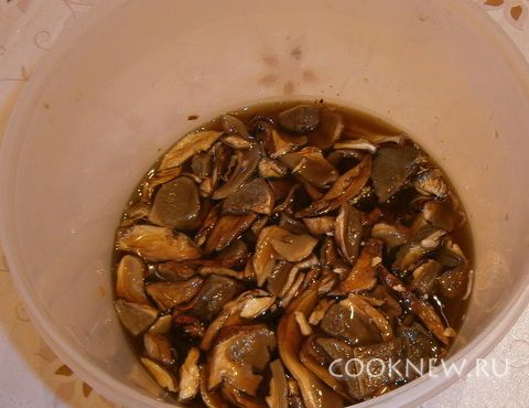 Грибы сначала замочить в холодной воде и оставить на 1 час. Затем отварить в течение 10 минут.