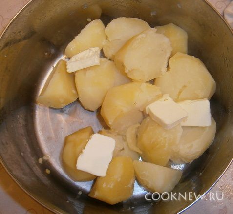 Картофель почистить, отварить, добавить сливочное масло и потолочь.