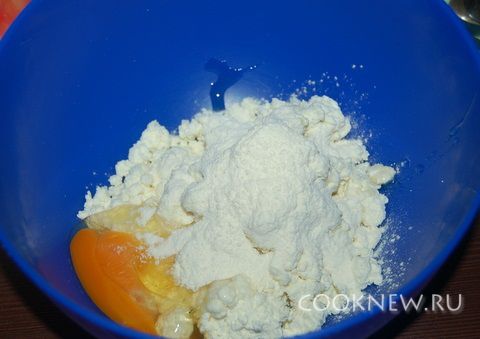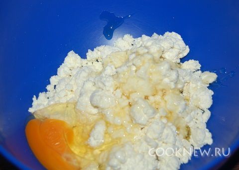 В миску положить творог, мед и вбить яйцо.