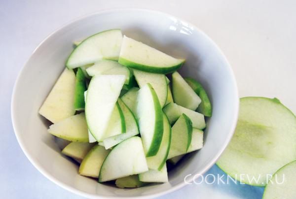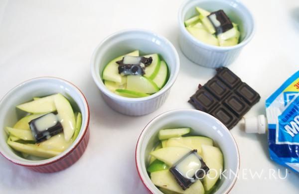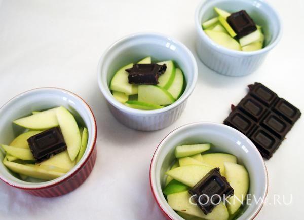 Разложить яблоки по формочкам и сверху положить по 1-2 дольки шоколада.