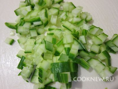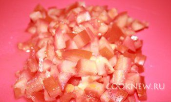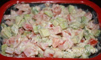 Смешать помидоры, огурцы и сыр. Перемешать. Сыр можно использовать любой творожный.
