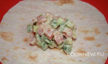Затем концы лаваша расправляем и добавляем туда еще заправки. Можно украсить зеленью.