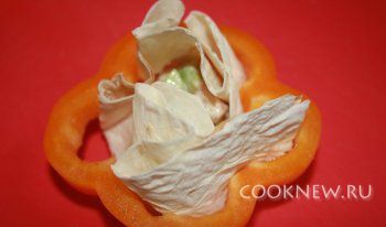 Края лаваша аккуратно собираем и продеваем в кольцо из перца.