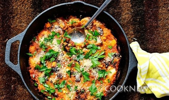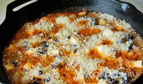 Панировачные сухари смешать с 2 столовыми ложками оливкового масла и посыпать блюдо.