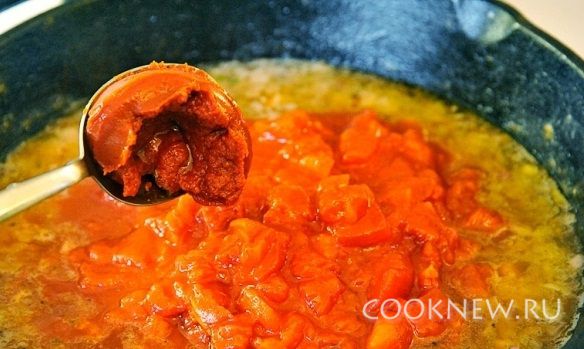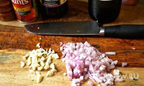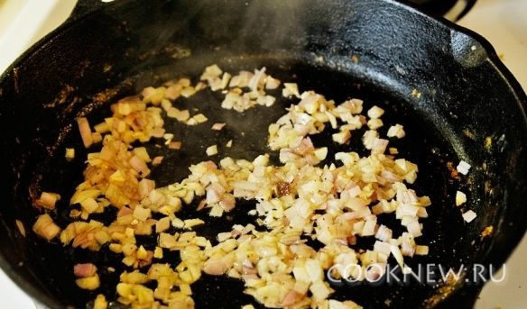 Обжарьте лук на масле(2 стол ложки) в течение 5 минут,затем добавьте чеснок и готовьте еще 1 минуту.