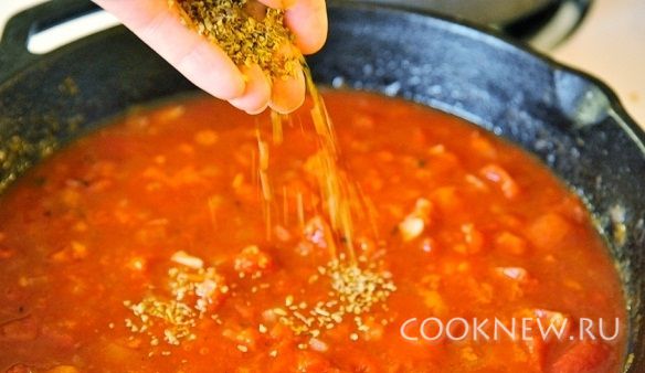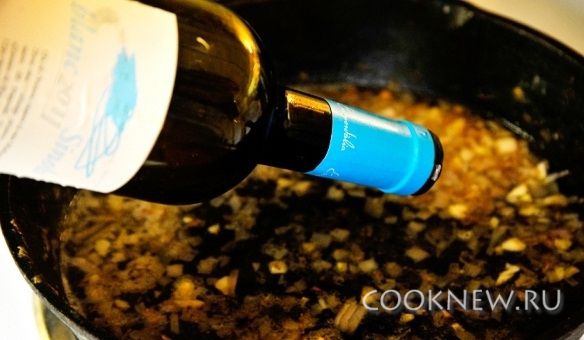 Влейте вино, когда вино закипит, готовьте еще 3 минуты,периодически помешивая. Вино должно выпариться на половину.