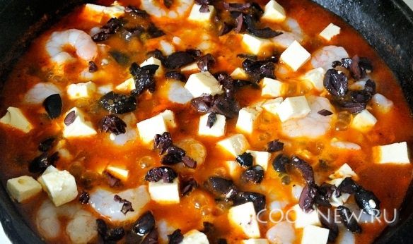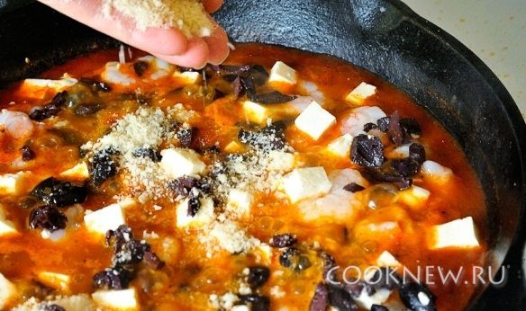 Затем снять сковороду с огня и добавить очищенные креветки.