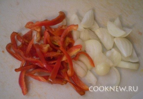 Порезать тонко перец и лук.